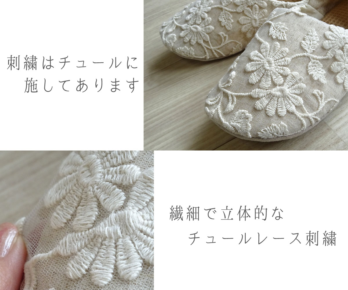 ■立体的な花柄刺繍を施したチュールレースをスリッパに縫い付けてあります。