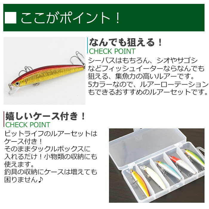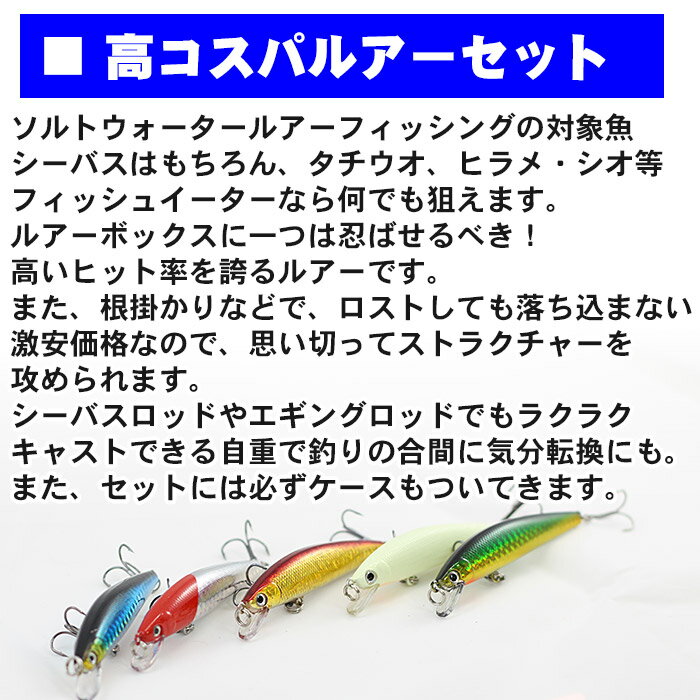 ロストしても落ち込まない安価タイプなので、初心者の練習や、上級者のカラーチェンジの一個に最適! 河口や岸壁・サーフなどの大場所で広範囲かつ効率よく探っていきたいですよね! 餌と認識しやすいフィッシュフォルムが活性の高いシーバスからスレたシーバスまでも艶めかしく魅了! 収納に便利なケース付きでお得なセットです。