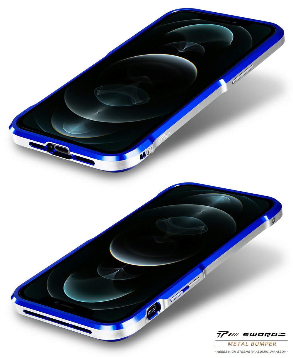 iPhone12 バンパー アルミ ケース 高品質 アルミバンパー ケース SWORD T12 バンパー 高級 アルミ製 メタルバンパー かっこいい ケース おしゃれ ネジ式 薄型 軽量 フレーム iPhone12(ブルー x シルバー)ストラップホール付 スマホケース ワイヤレス充電 送料無料